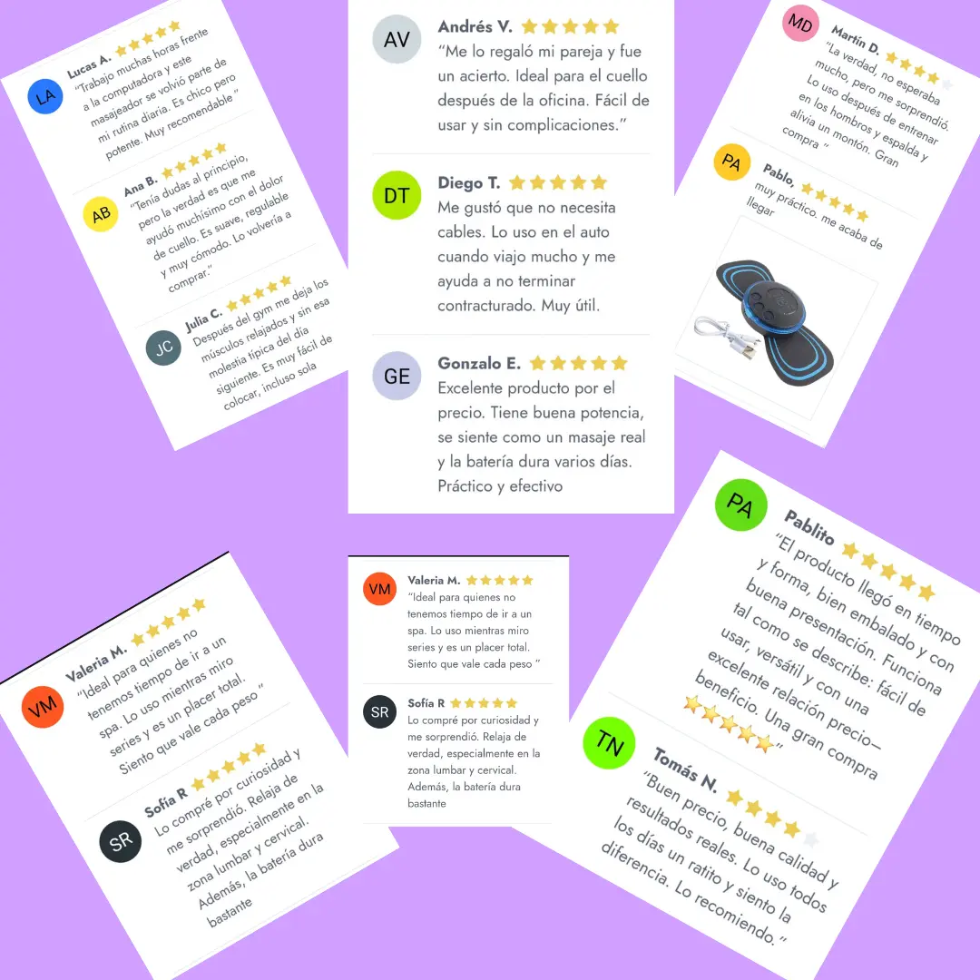 “No pensé que un aparatito tan chico pudiera aliviar tanto. Lo llevo en la cartera y lo uso en la oficina cuando siento el cuello cargado. ¡Me encanta! 😍”